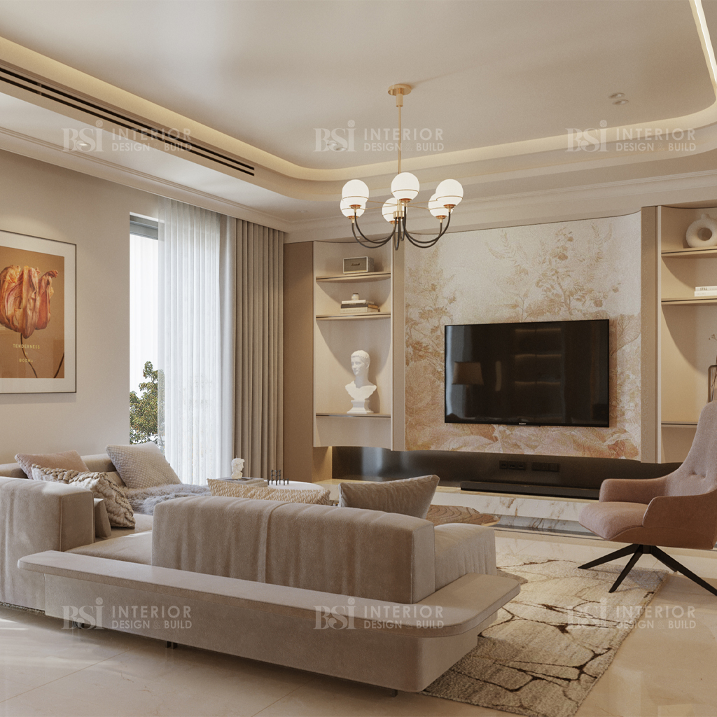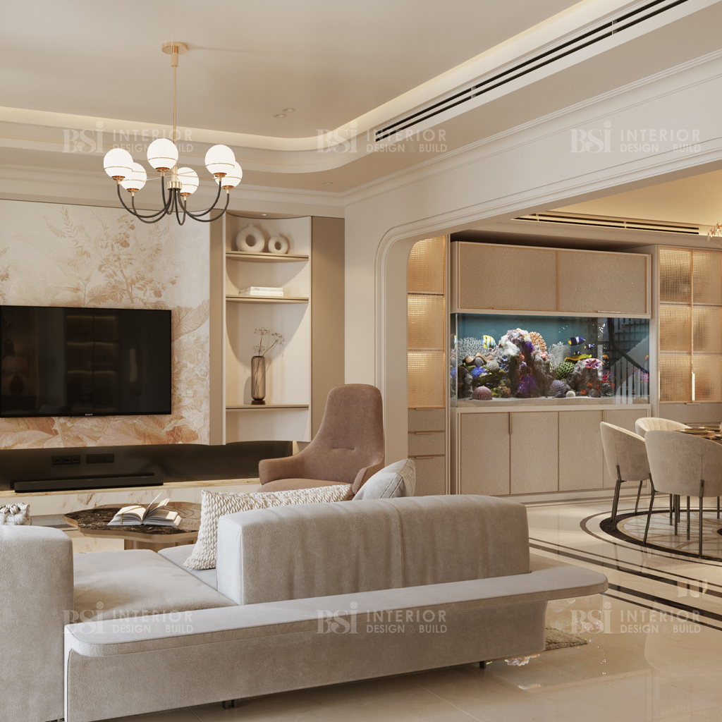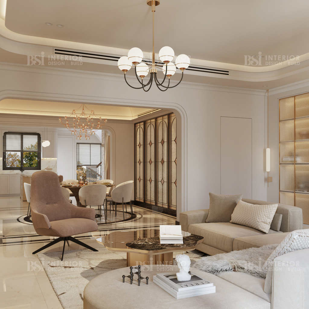 Phòng khách ở công trình này là sự kết hợp hoàn hảo giữa nhiều phong cách đem đến một không gian mang chất riêng. Từ bản thiết kế nội thất độc đáo cho đến sự lựa chọn chất liệu tinh tế phản ánh gu thẩm mỹ đặc biệt của chủ nhân trong từng món đồ. Đó là chiếc ghế sofa hiện đại tối giản đến những tác phẩm nghệ thuật tuyệt đẹp, mỗi yếu tố đều được chọn lựa cẩn thận để mang lại cả sự hài lòng về mặt thị giác và tiện nghi hàng ngày.